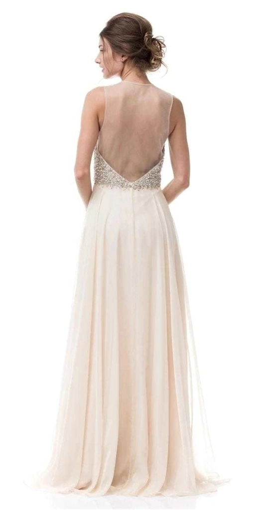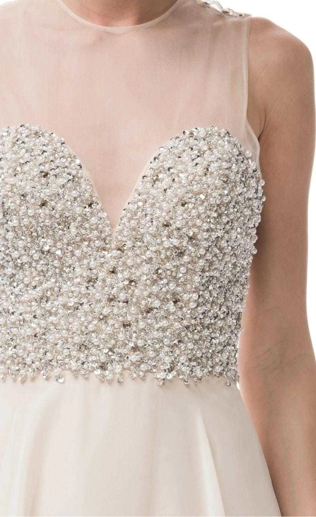 Vestido bordado con perlas, espalda escotada escote en corazon.